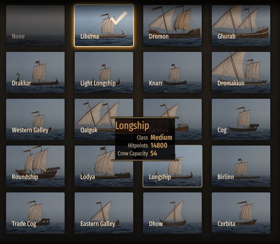 Средние: liburna (22000, 60), corbita (19200, 35), trade cog (16000, 30), longship (14800, 54), cog (18600, 60), sambuk (20000, 60)