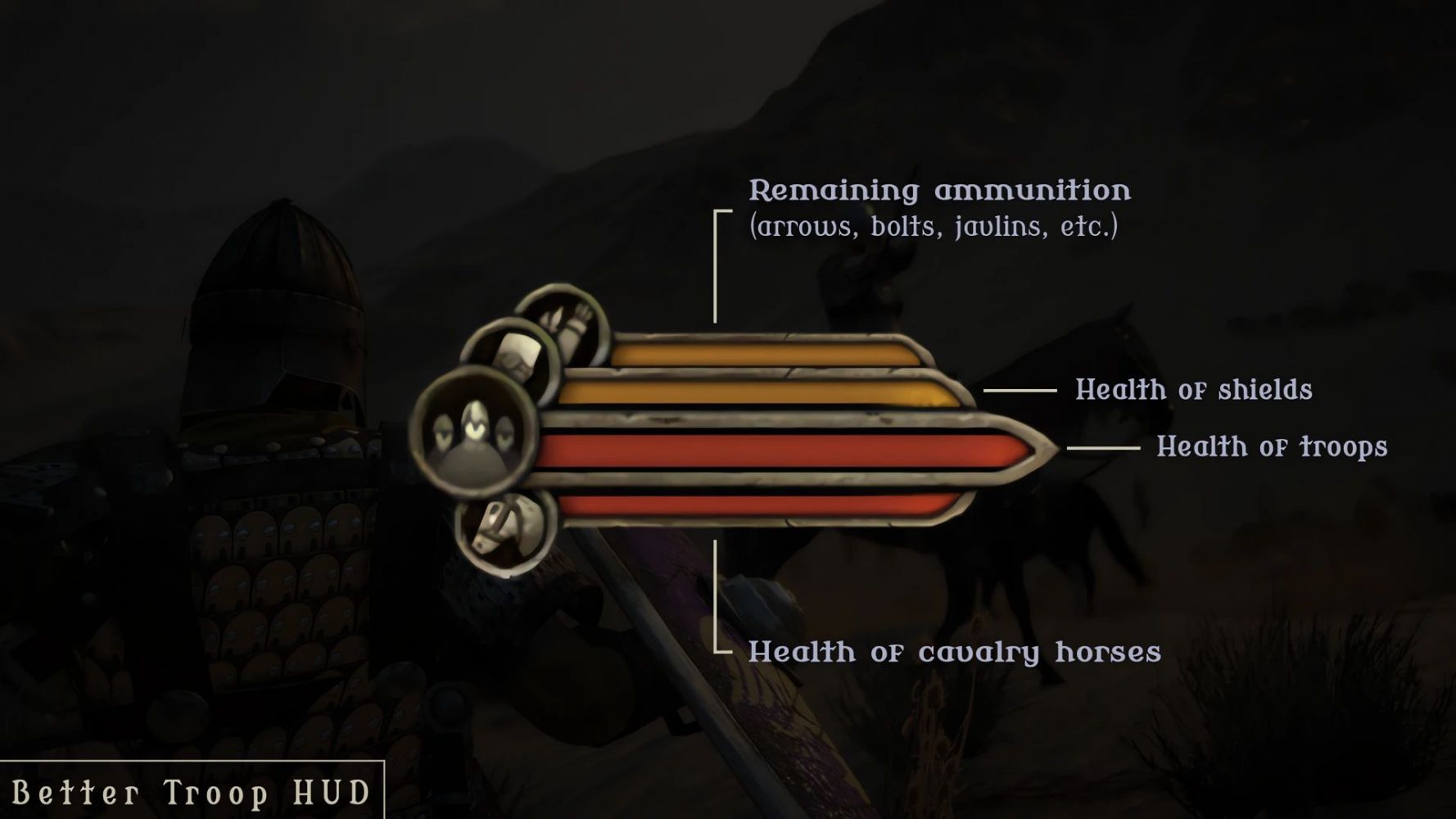 Добавляет во время сражений дополнительную панель с информацией об отряде - среднем здоровье солдат и их ездовых животных, состоянии щитов и боезапасе. Внешний вид панели зависит от типа отряда