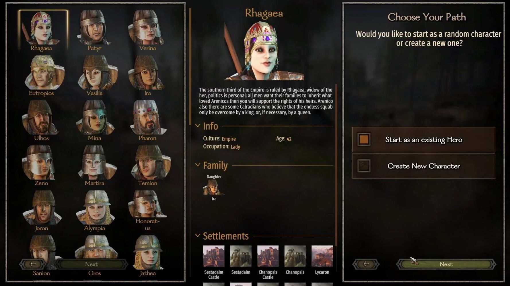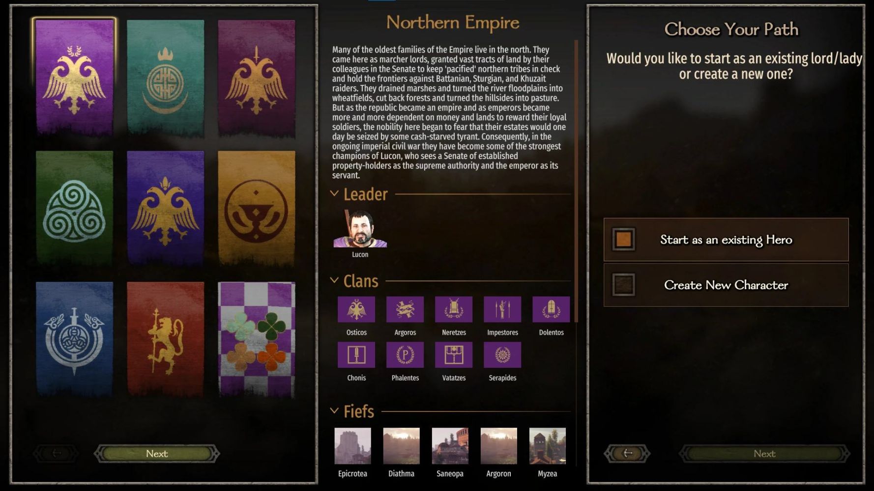 Данный мод позволяет начинать новую кампанию за любого из существующих на этот момент лорда с сохранением его текущего статуса (клана, владений, отношений и т.п.). Поддерживает как оригинальную игру, так и различные моды.
