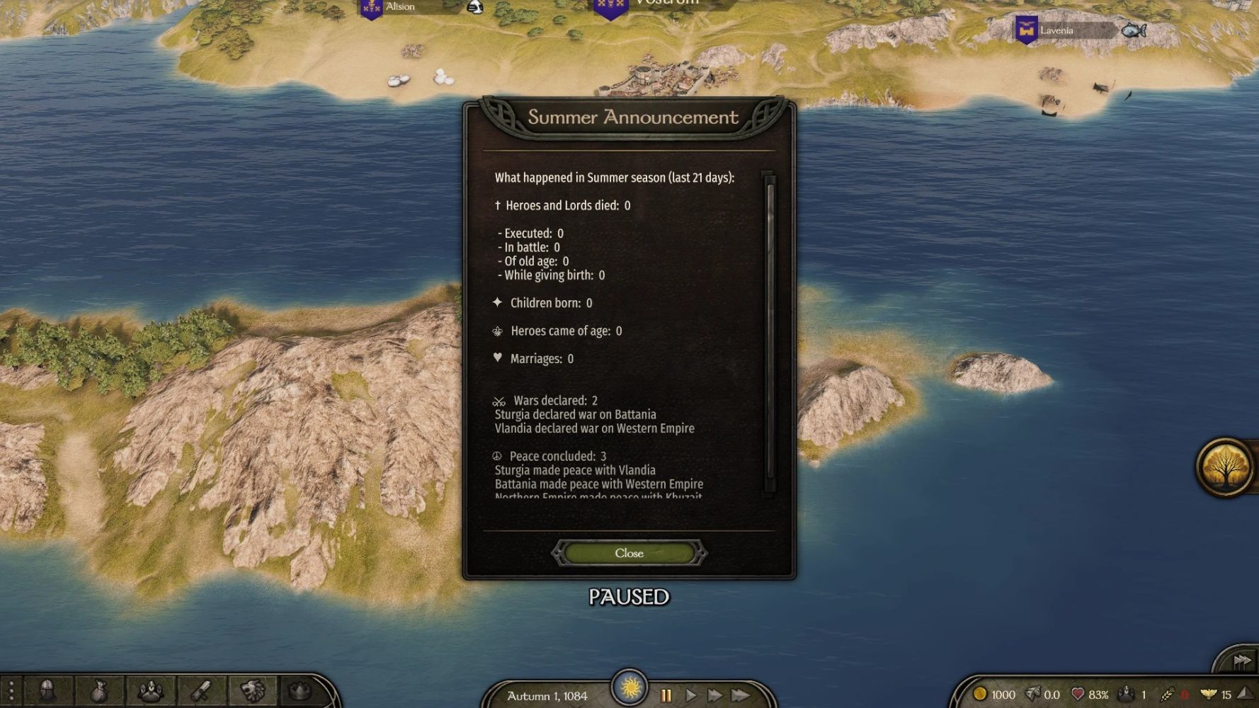 Этот простой мод добавляет периодический отчёт о том, что случилось в Кальрадии за прошедший сезон - смерти, рождения, заключенные браки, объявленные и завершённые войны и т.п.