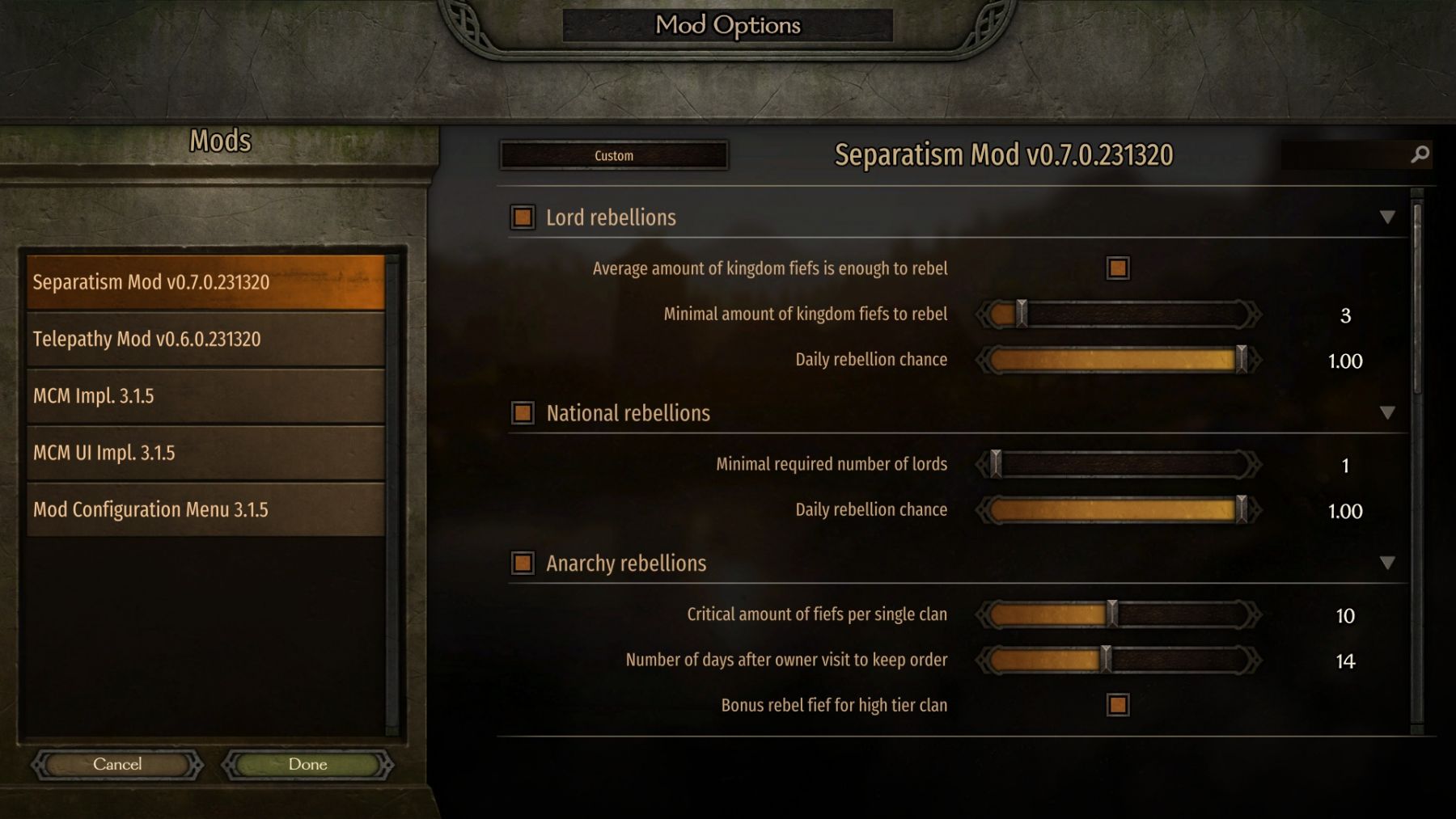 Этот мод активирует в Bannerlord изначально отключенные разработчиками, три типа восстаний: восстания лордов, национальные бунты и локальные восстания поселений. У каждого восстания есть свои причины, которые можно предупредить или, наоборот, спровоцировать. Бунты могут приводить к отделению поселений или целых регионов, смене правителя. Вы также можете сами настроить интересный вам уровень их интенсивности.