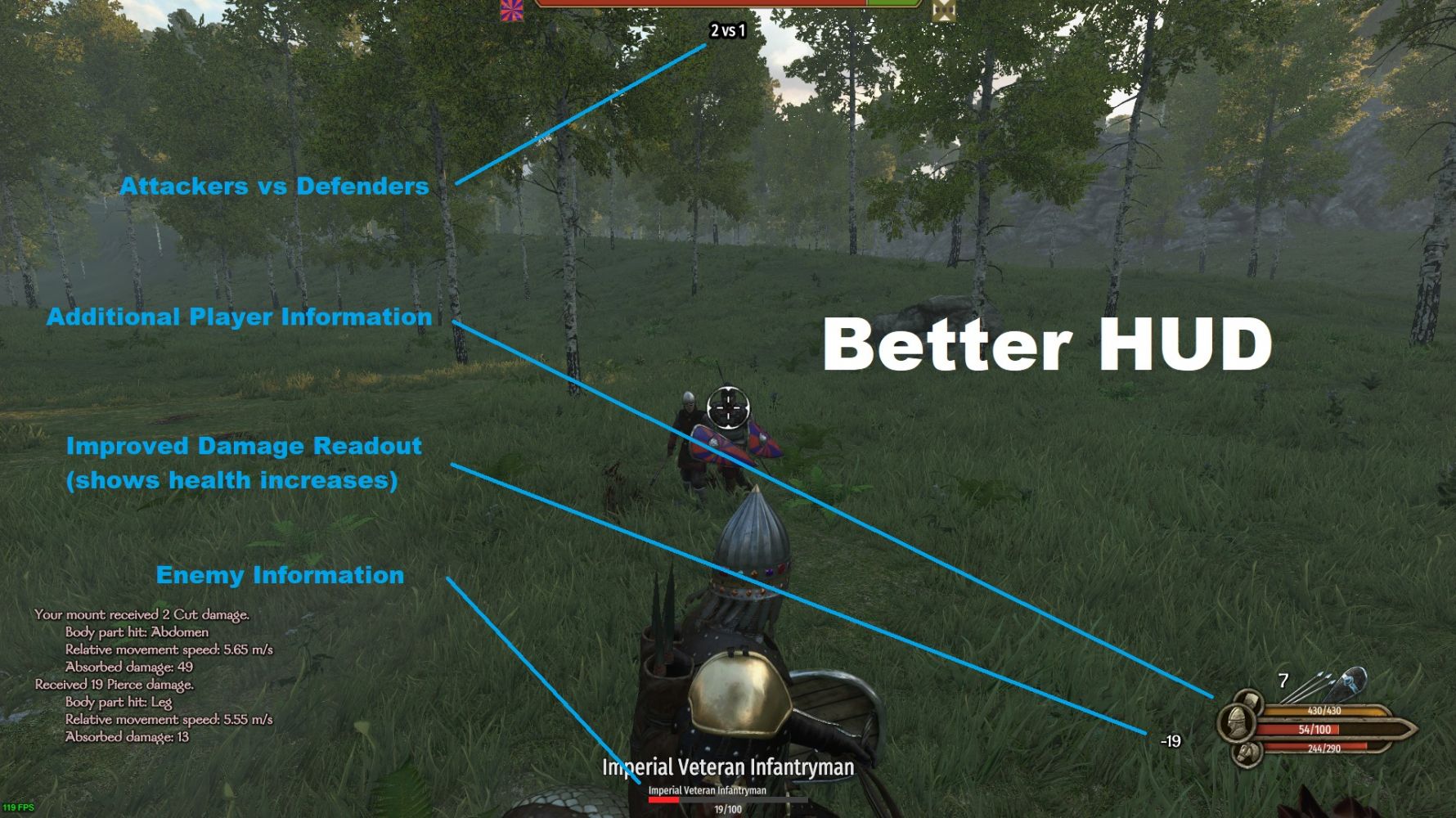 Данный мод улучшает отдельные элементы интерфейса игры: изменяет внешний вид блока здоровья главного героя и его экипировки, показывает дополнительную информацию о ходе сражения, некоторое время отображает информацию о здоровье последнего атакованного противника.