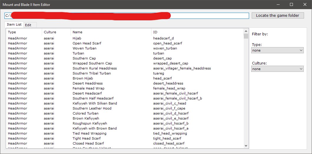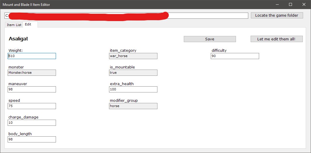 Данный редактор позволяет изменять параметры уже существующих в игре предметов - как основного модуля игры, так и различных модов: уровень защиты брони, скорость и маневренность лошадей, урон оружия и другое. Благодаря этому проекту, сделать собственный ребаланс можно без ручной правки файлов, но вот добавить через программу новые предметы, к сожалению, пока что нельзя.