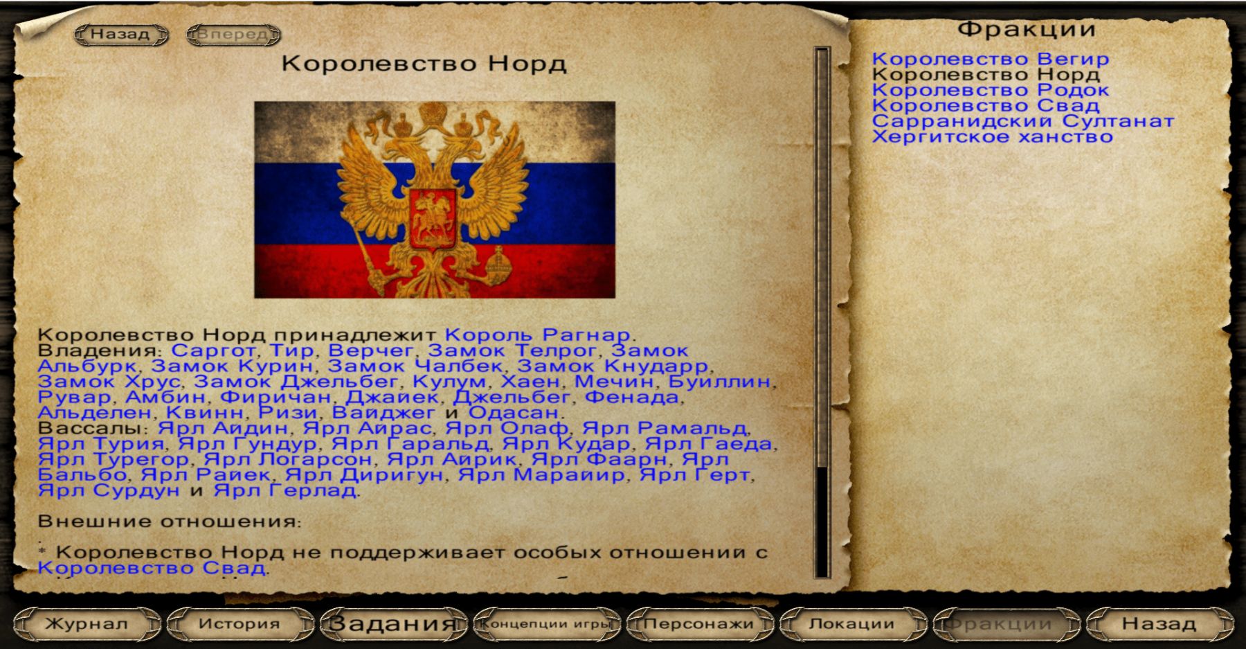 В этой небольшой модификации фракции заменены на Монголов, Англию, Рим, Японию, Россию и Персию. Соответственно им переделаны флаги. Переделаны загрузочные меню и изменены названия поселений и государств.