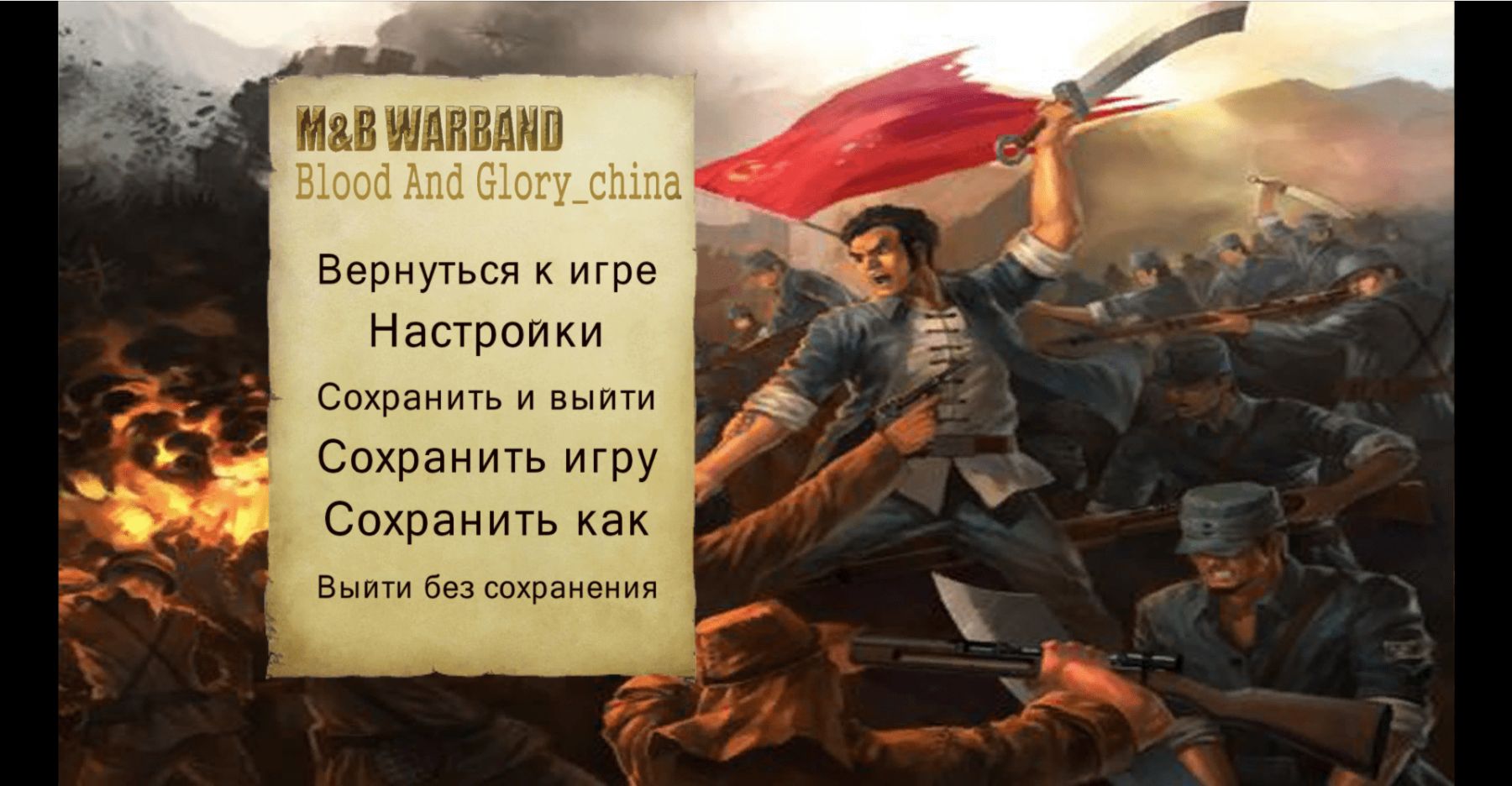 Это прекрасная историческая модификация от китайского автора с новой музыкой, звуками, баннерами, местностью, мортирами, гранатами и меню (Здесь своя прелесть, они выполнены в несколько гротескном стиле. Можно заметить мужественного партизана на фоне красного флага и орду, топчущую баннер Японии, что очень символично. Помнящие историю уже поняли, что воспоминания о японском вторжении присутствуют). Усилены отряды дезертиров, лорды переодеты. На переделанной глобальной карте много интересных мест, например таверна "На перепутьи", "Крепость Дорак", "Поля сражений" и "Зендар". Некоторые локации сделаны с нуля. В городах есть банк, а гарнизон увеличен до 800 - 900 человек. Линейки развития всех воинов изменены, а на прилавки торговцев поступили тонны формы. Великолепно подойдёт для любителей огнестрельного и метательного оружия, на одной из иллюстраций заснят взрыв с дымом и огнём. Всё для фронта, всё для победы, как говорится. Недаром название переводится как "Кровь и слава Китая".