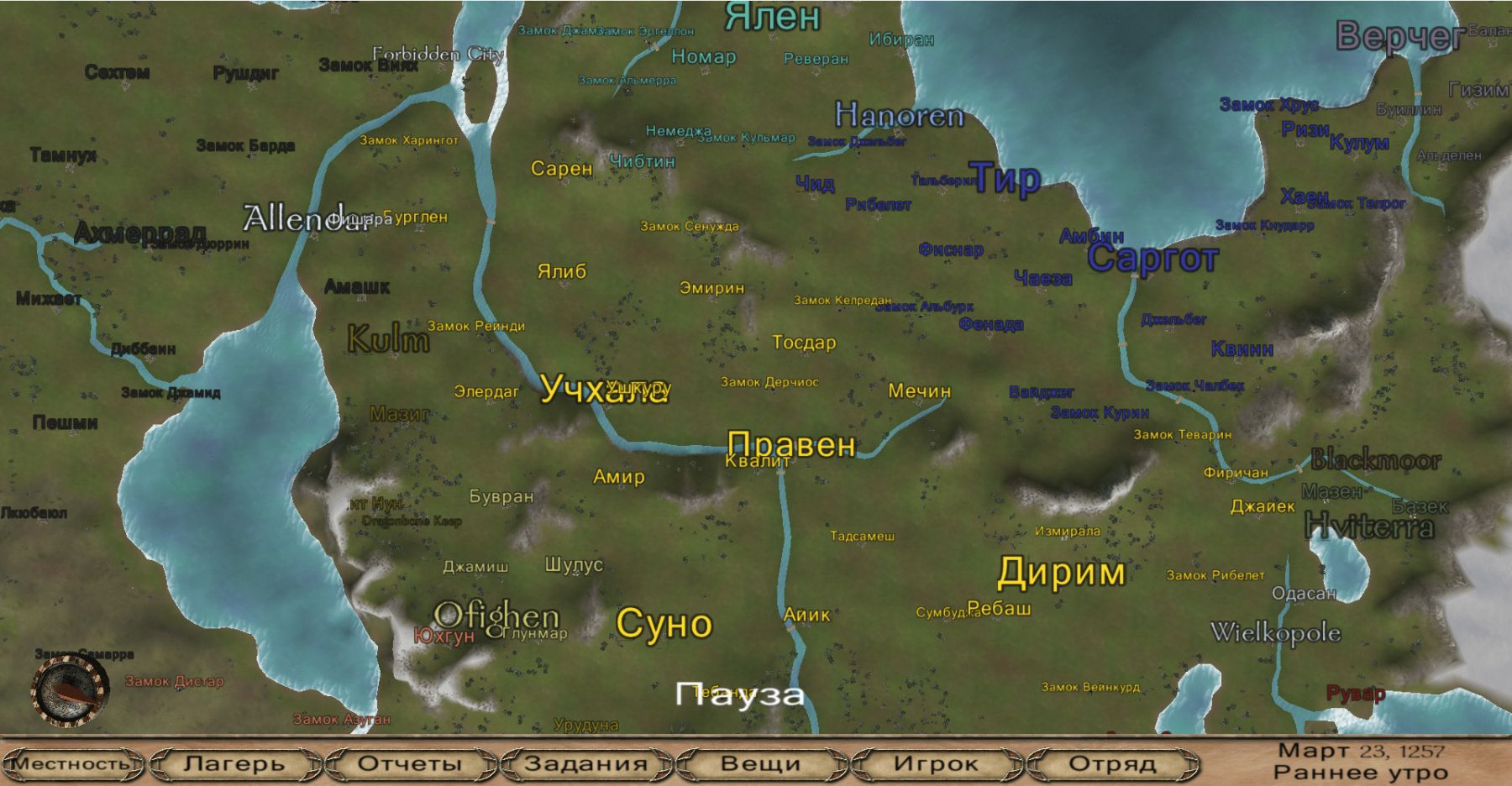 Это модификация для Mount & Blade о религиозных войнах в альтернативном мире эпохи Возрождения Европы 1526 года, по заверениям автора напоминающая The Eagle и The Radiant Cross. Достаточно небольшую, но отлично изменённую карту населяют 13 фракций, каждая из имеет своих уникальных воинов, часто имеющих продолжение линеек развития и интересную экипировку вплоть до пиратских повязок. Владения некоторых королевств, впрочем, ограничиваются одним городом и парой деревушек. Особо любопытна одна из сцен, архитектура которой полностью соответствует иконке (смотреть иллюстрации). Усовершенствованы бандиты, они стали более разнообразными, меню, флаги, музыка заменена на более мрачную, добавлено много новой брони. Есть Соляные копи и Таверна четырёх дорог. Встроена дипломатия. Переделаны все наёмники. Есть огнестрельное оружие (если не найти в магазине - можно получить как трофей в сражении). Можно встретить других спутников. Идёт на warband 1.174, перевод не требуется, если установлен на оригинальной игре, но, чтобы в полной мере оценить мысль разработчика - необходимо включить английский язык.