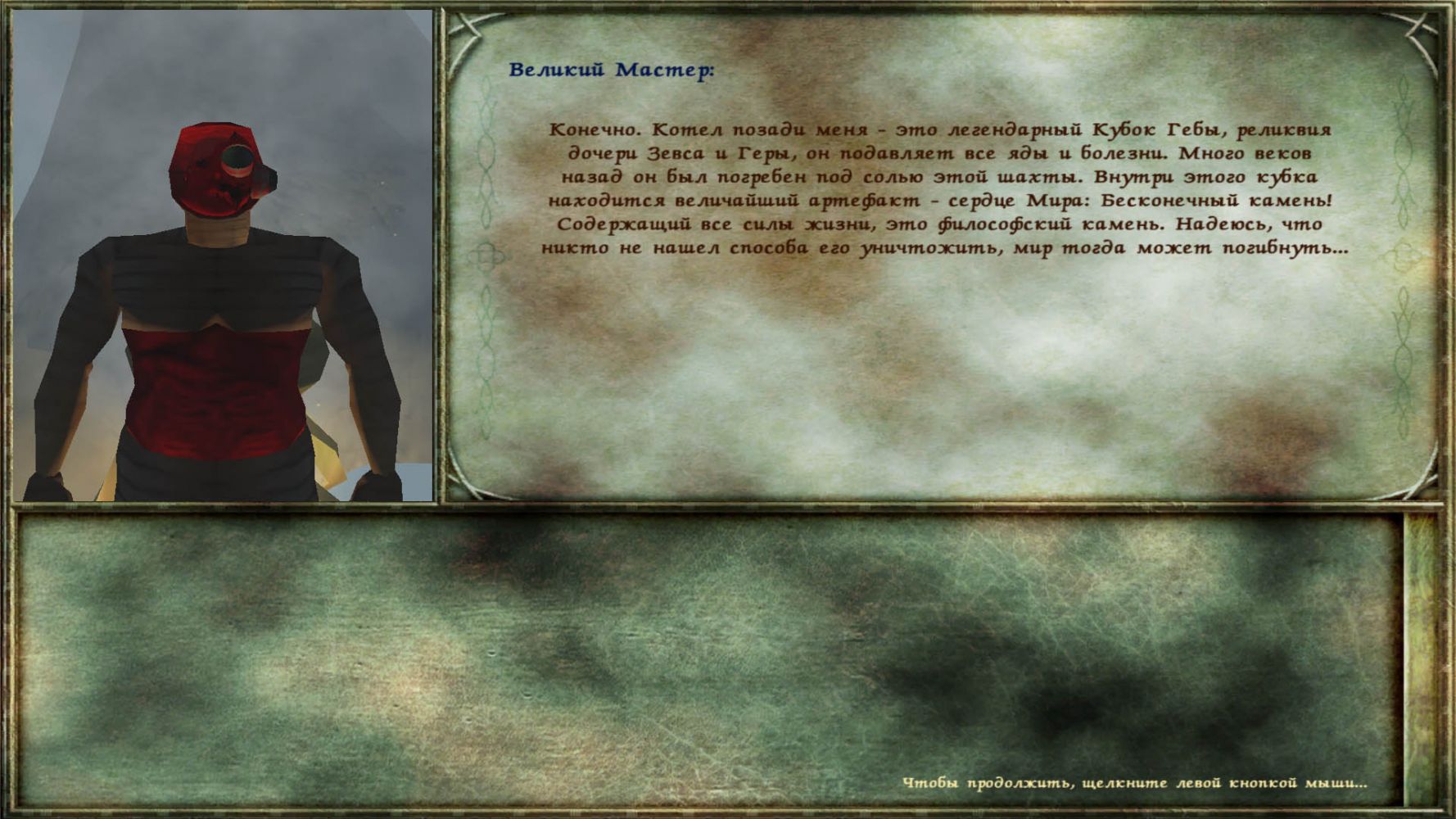 Находим шахты, а в них и этого Великого Магистра - Леонардо да Винчи. В котле за ним лежит Кубок Гебы (Бесконечный камень), который надо беречь от приспешников Кровавого фонтана. Поговорив с ним получаем отличный оружейный сет ''Волчья стая'' (ружье+патроны+кинжал), забираем Бесконечный камень и узнаем, что Дюпен это робот.