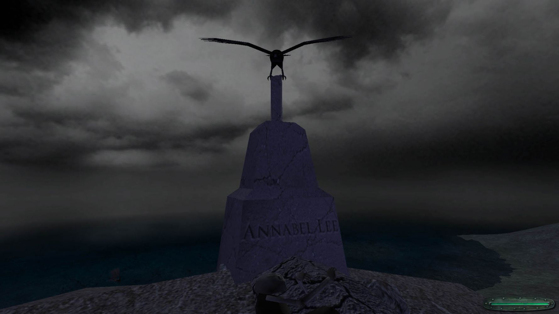 В деревне Фиснар, на самом верху горы находится могила Анабель Ли. В могиле, кроме обязательных костей, находим квестовое кольцо этой женщины. Расспрашиваем Ворона о нем. Еще одна загадка мода.