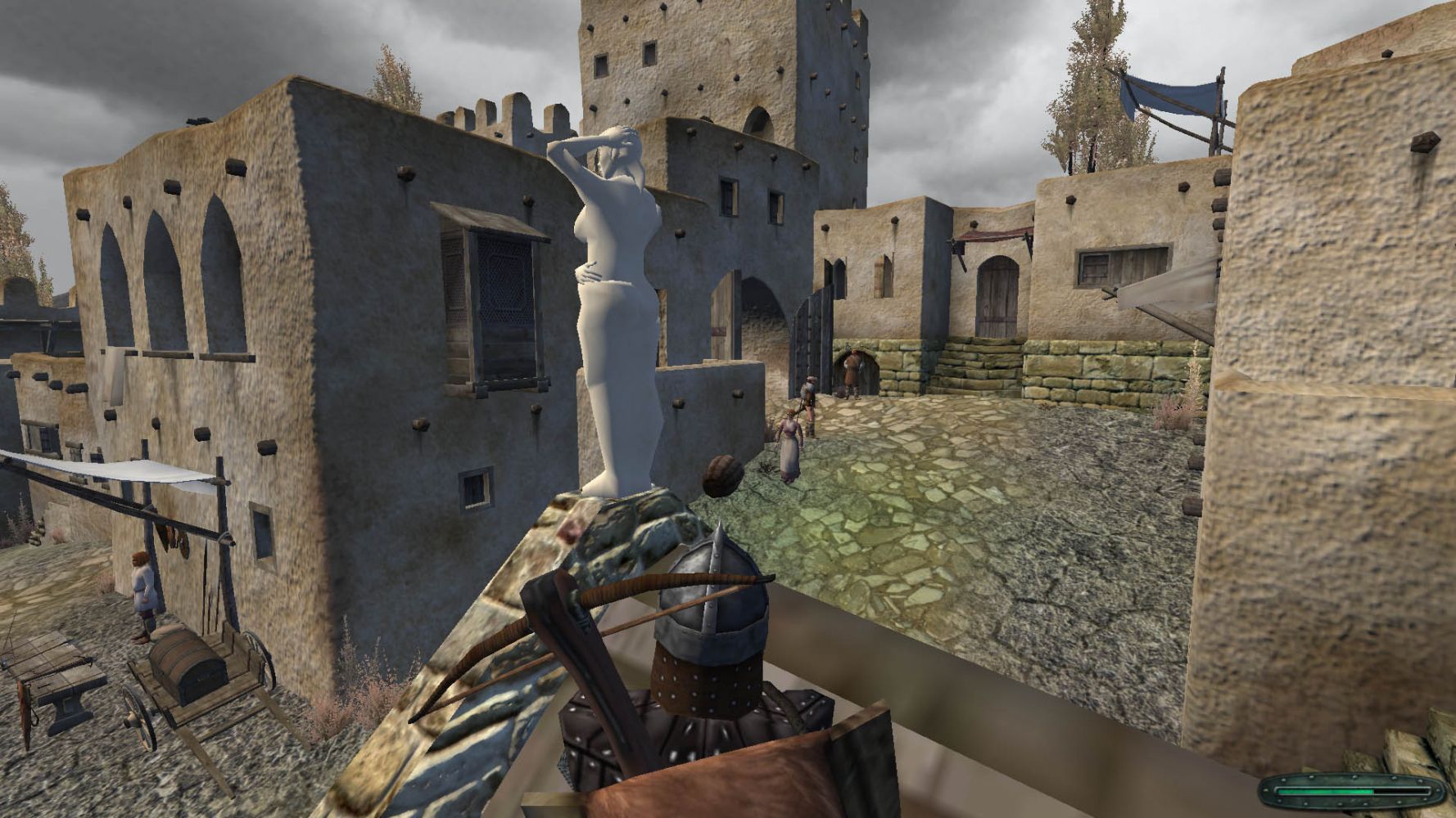 И так, в таверне г. Нарра мне повстречался Алхимик и предложил дуэль с пари (Это квест '' Адамант Алхимика '' из Темных легенд Кальрадии). Победив, изготавливаем через меню лагерь : Выпад Алхимика (меч), Кинжал Алхимика (щит) и Удар Алхимика (шлем) с отличными характеристиками.