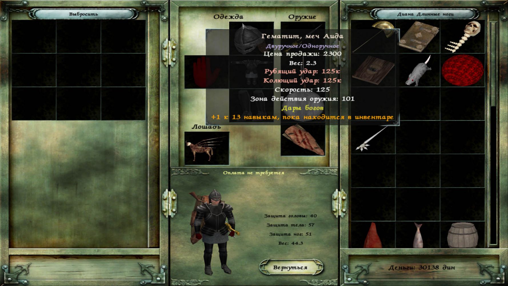 Став Высшим жрецом Некромантии (последняя ступень для плохих мальчиков), отправляемся в деревню Вейдар. Там беседуем с Хароном и, наплевав на его предупреждения, суем голову в царство Аида. Необходимо иметь в инвентаре 13 изготовленных с помощью Некромикона предметов, дающих прибавку к навыкам, и Бесконечный камень. Аид вручит Вам первый предмет из сетового набора '' Дары богов '' - меч Гематит.