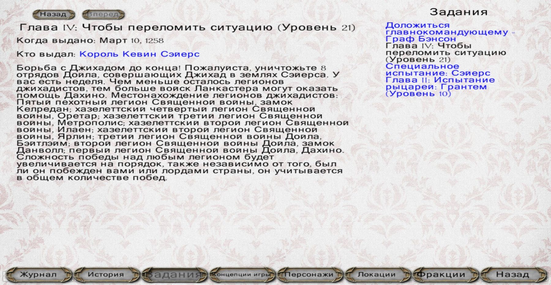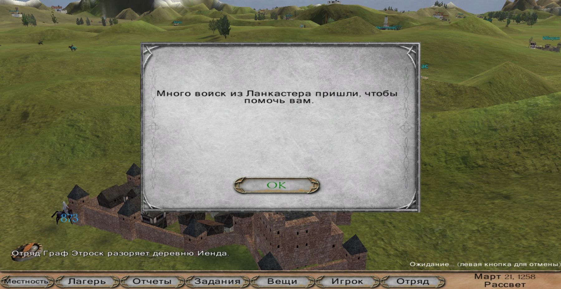 Многие из вас, наверно, часто хотели не просто выносить толпы врагов, но и иметь какую-то цель. Эта модификация как раз предоставляет такую возможность. К этому замечательному моду существует несколько русификаторов, но, поскольку оригинальный язык - китайский, существует разница и некоторые неточности. Поэтому гайд написан с разными вариантами названий и кнопок. Подчеркну также, что я не стану описывать только прохождение (его и так можно боле-мене понять из переводов, прочтя вкладку "задания", а разберу некоторые особенности, которые могут помочь и покажу то, что иногда бывает трудно найти. Чтение китайского официального форума подсказывает, что иногда людям трудно найти определённое место, отряд, либо понять, как двинуть сюжет дальше. Добавлю также, что автор продолжает работать над модом, и возможно, когда-либо этот гайд будет пополнен. Обратите внимание, что модификация построена на прохождении сюжета, в неё нельзя играть как в обычный мод без риска запороть прохождение. Поэтому совет: не вступайте в первую попавшуюся фракцию, вступать потом понадобится по сюжету конкретно к королю Кевину Сайерсу (фракция сайерсов). Можно наняться к нему наёмником, спрашивайте у лордов задания, пока они не предложат контракт. Заодно он оплатит содержание всех воинов своей фракции в вашем отряде. Также, лучше не спрашивать у лордов других фракций специальные задания (фраза "чему бы вы могли научить меня?") до поры до времени, как правило они поручают убивать их врагов из другой фракции. Фраза появляется после вступления в отряд Джеффри, он же будет считать поверженных. Старайтесь не захватывать себе перечисленные в данном руководстве города, иначе, возможно, что-то пойдёт не так. Если вы обнаружили нечто интересное, о чём здесь не написано - не стесняйтесь пополнить комментарием. Итак, поехали.