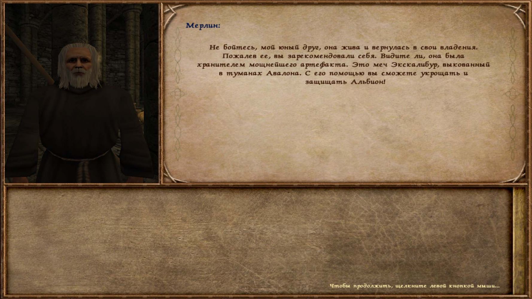 После сражения она сбегает в таверну Камелота. Найдя ее там, по-рыцарски, нежно в поединке побеждаем даму и от нее получаем новый квест ''Покорить замок Камелот и встретиться внутри его с Мерлином''. Захватываем замок и Мерлин торжественно вручает нам всенепременный легендарный меч Экскалибур. Задание '' Найти владычицу Озера '' выполнено. Так и утверждается настоящая власть.