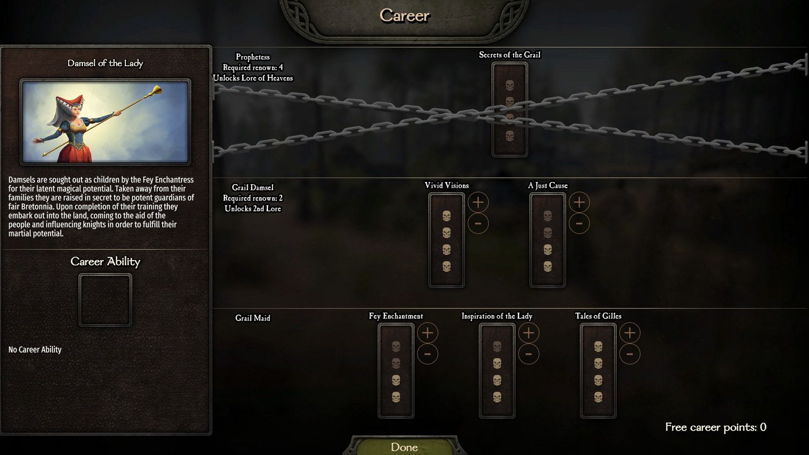 • Рыцарь бретоннии. Обычный человек, только предпочитающий скакать, а не бегать на своих двоих, на что и рассчитана его ульта. Основной упор пути - еще больше улучшения кавалерии и значительная прибавка к здоровью ГГ. Среднячок по эффективности и требует хорошим навыков для применения спецспособности