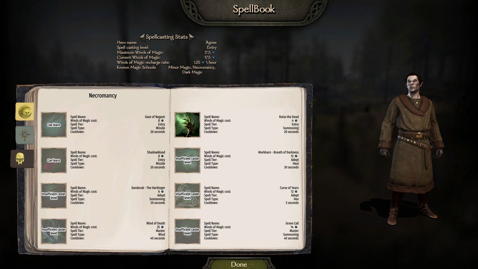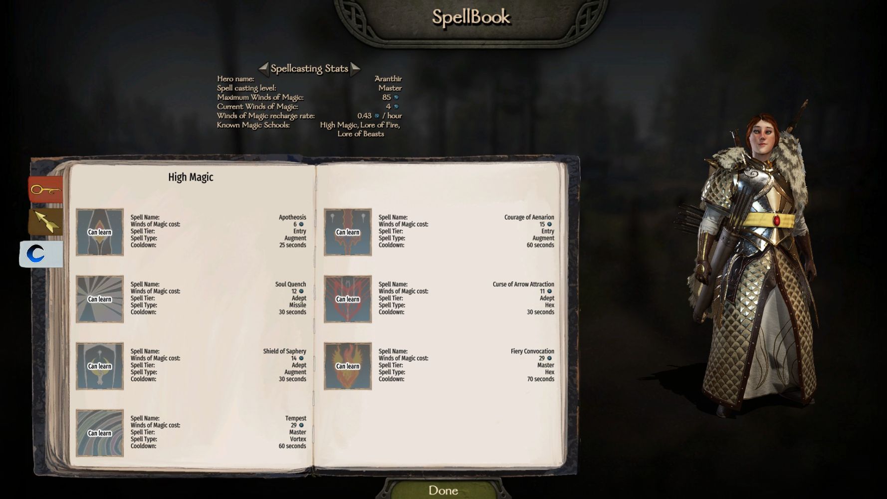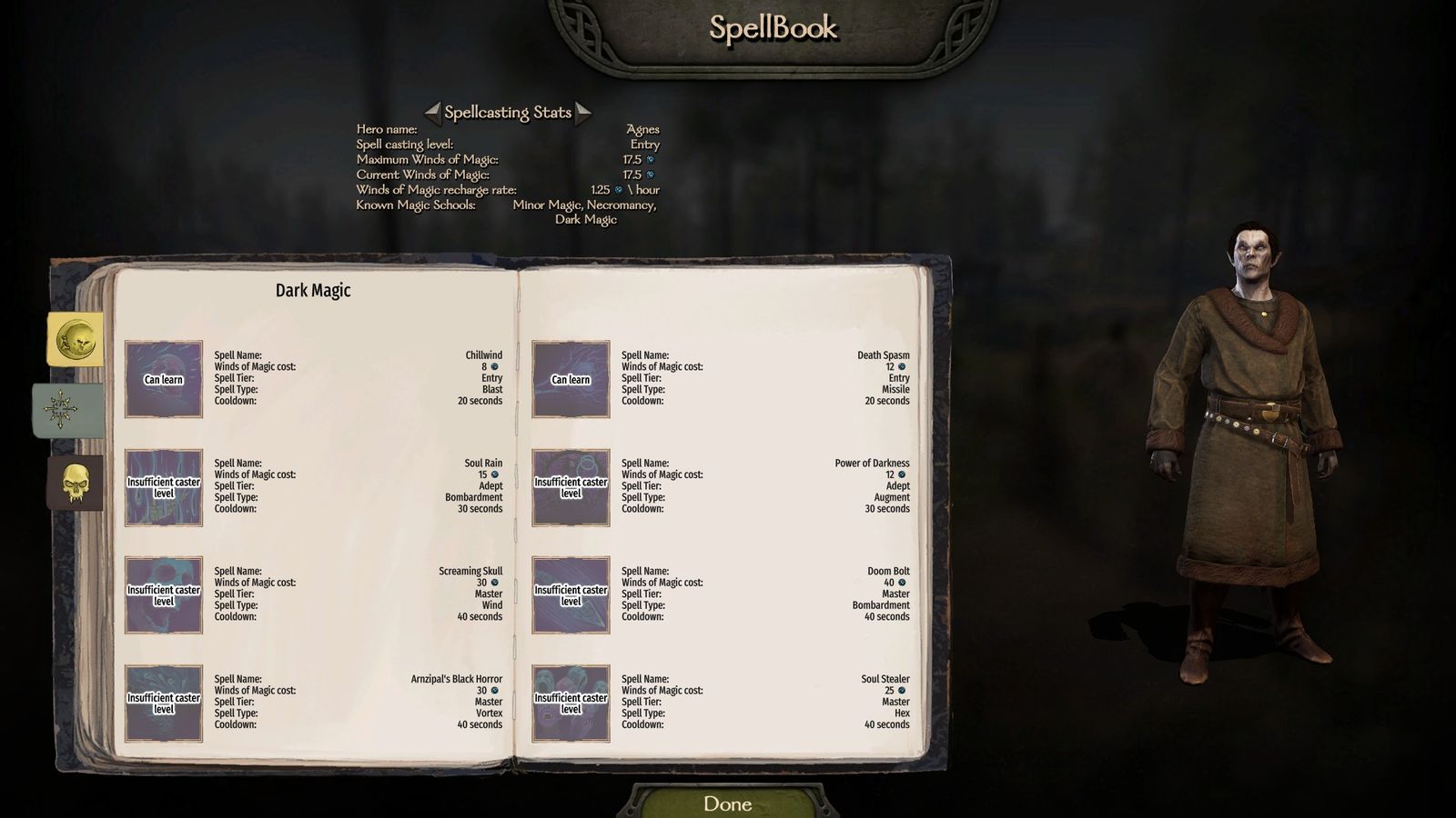 Магия открывается для соответствующих классов. В зависимости от класса, игрок на старте будет знать одну или две школы магии: огонь, смерть (некромантия), тьма, свет, жизнь, звери, небо, а также одну универсальную для всех - младшую школу. Также старт за мага дает вам некоторое количество очков в навыке "колдовство" (spellcraft). Магом также можно стать и за другой класс - просто поговорив с магистром, но в этом случае игроку будут доступна лишь минорная школа магии кроме того он не сможет ее применять пока не прокачает свитком хотя бы первый перк в линейке колдовства. Тем не менее, даже в этом случае магия может быть полезна за счет заклинания самолечения. Навык колдовства также повышает эффективность магии, ее длительность, максимальный запас ветров и скорость их восполнения после боя. Открытие новых заклинаний осуществляется у магистров в ряде городов: нужно покупать у них заклинания. Стоимость покупки может быть уменьшена в путях персонажа. Заклинания делятся на три типа в зависимости от умений - новичок (первый перк колдовства), адепт (третий перк колдовства) и мастер (пятый перк колдовства).