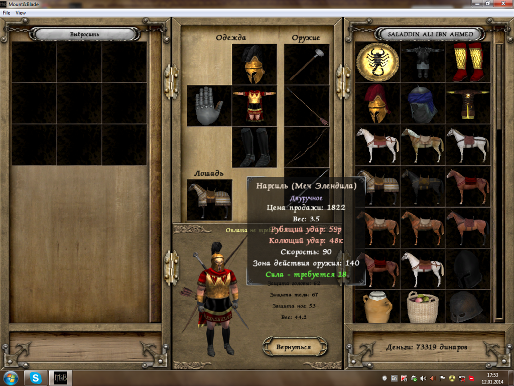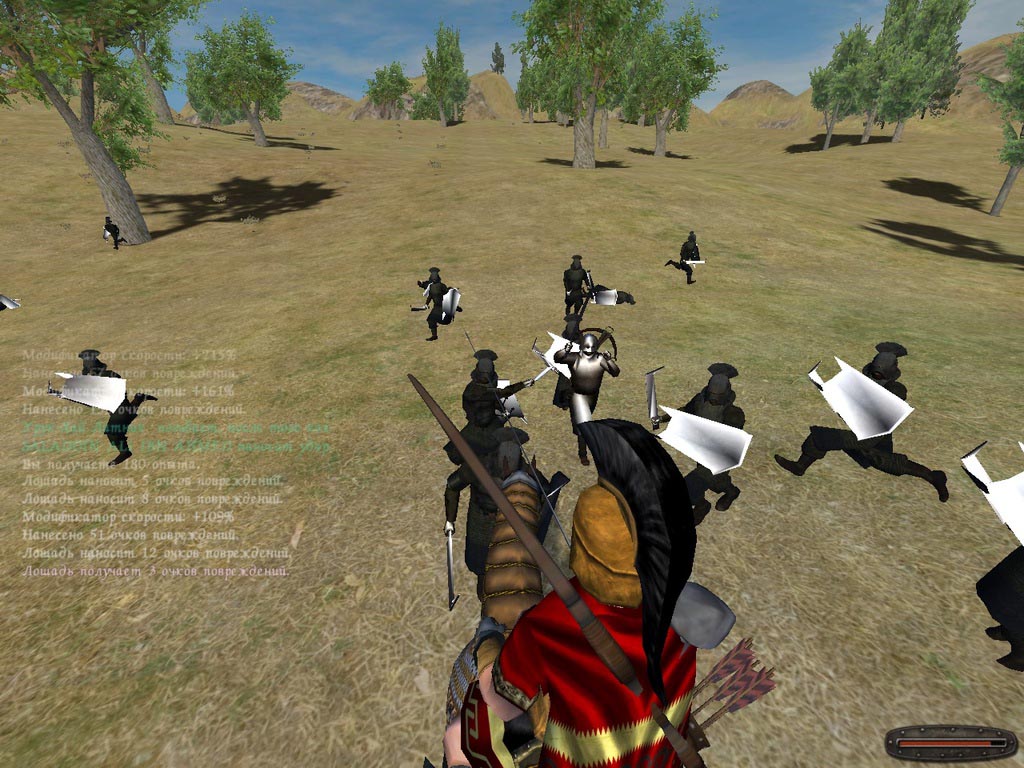 Мод сложен для начинающих, даже опытных игроков. Тут нет привычных мелких шаек легко убиваемых лутеров, поэтому прокачать ГГ трудно. Вместо них бродят дезертиры, урук-хаи (просто орки) и банды здоровенных лесных урков и троллей, численностью от 40 до 80 существ. Понятно, что у едва родившегося ГГ недостаточно первоначального капитала для найма отряда, способного разгромить таких противников. Следовательно, первой целью становится не быстро сколотить годный отряд (поскольку денег всё равно нужно много), а потихоньку накопить их. Простейший вариант: пойти на арену и подраться, опыт идёт (не турнир и не на деньги, обычный кулачный бой). Так можно подрасти на пару уровней. Затем проще всего нанять пару рекрутов и присоединяться к лордам, бьющим орков, дезертиров и тому подобный сброд. Так потихоньку набирается опыт, а в случае победы над дезертирами можете получить и что-нибудь из вещей. Заодно растут ваши рекруты. Будьте осторожны, если лорд бьёт отряд орков: часто среди них попадаются тролли, а они неубиваемы (глюк мода). Всегда смотрите, кого именно бьют, наведитесь мышкой на битву и разглядите состав вражеского отряда. Так растите, пока ГГ не получит ещё несколько уровней. Можно приторговывать. Некоторые товары дешевле в деревне, и дороже в городе, присмотритесь внимательно. Можно также наняться на службу, тогда сразу получите немного денег, и, что самое главное, сможете воевать с союзниками, которые в этот период очень нужны. Тут тоже есть свои тонкости. Король Теоден сильно глючит. Победа над ним отнимает известность, причём довольно много. В итоге, если у вас сильный большой отряд и вы победили, половина может тут же разбежаться, поскольку перестанет помещаться в отряд. Что самое скверное, выходы без сохранения и насколько помню даже автобой эту проблему не решают. Единственное, что можно посоветовать - это разгромить его государство как можно быстрее, первым, чтобы поменьше с ним воевать. Тогда Его Глючное Величество исчезнет из игры, и больше не будет вам мешать. Очень хорошо можно заработать, оглушая и продавая морских пиратов. Водятся на берегу крупными отрядами, но для среднепрокачанного ГГ с небольшим отрядом конницы не страшны. На них берите более бронированную лошадь, а для войны с конными фракциями - наиболее быструю. Из оружия лучшее что можно советовать, это Меч Элендила (иногда продаётся в магазине и есть у кого-то из НПС-спутников, смотрите скриншот).