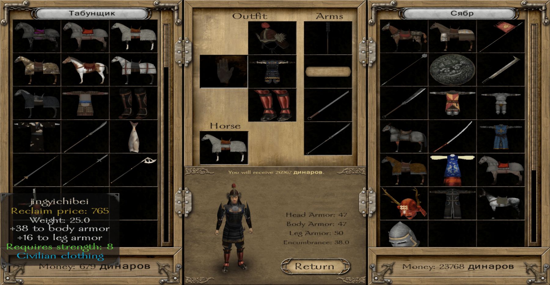 Эта модификация от китайского автора очень напоминает "Dragon xuan huang", вероятно одна из них создана на основе другой. Действие происходит на той же карте, но изменены некоторые меню, воины, лорды и добавлена гражданская одежда (синяя надпись на скриншоте). Над солдатами появились полоски здоровья, встроена дипломатия, можно встретить задания "убить лидера морских пиратов" и подобные. Есть и дополнительные настройки. Перевод на русский язык загрузится автоматически, если установлен на Warband, но вы можете поставить специально сделанный.