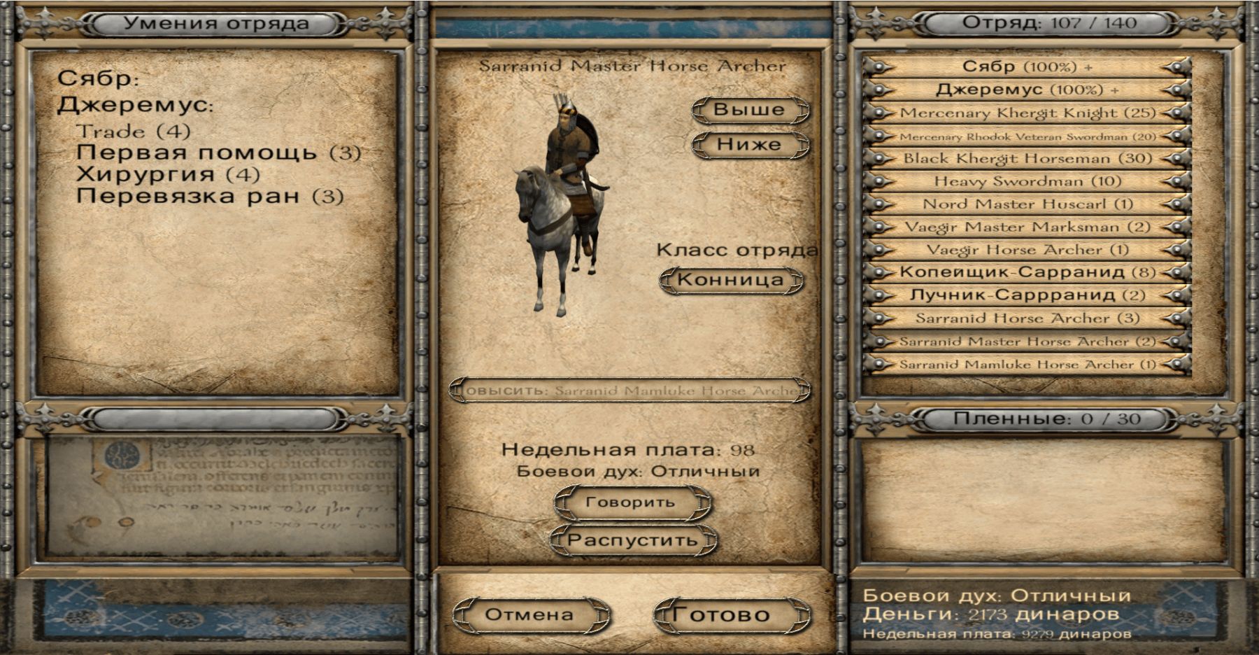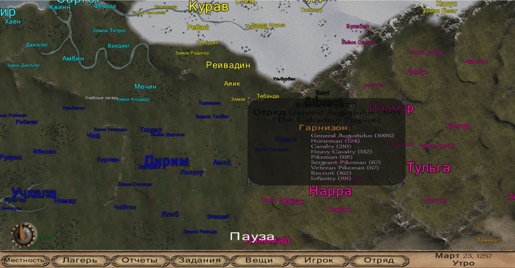 Эта довольно жирная модификация будет хороша для тех кто не хочет огромных перемен, но интересуется приятными мелочами, коих здесь скопилось на среднюю солянку. На глобальной, затянутой туманом войны, родилось ещё одно королевство, в итоге стало семь, и все их цвета заменены. Существует грандиозный ассортимент флагов, лошадей и соляные копи. Появилась новая мрачная музыка, компаньонов можно собрать в первом городе, немного увеличены атрибуты при создании героя (не выбирайте отцом дворянина во избежание ошибок), наёмники в таверне пойдут к вам на службу крупными отрядами. Со спутниками можно поговорить о книгах, сослуживцев дозволено вызывать на тренировочный поединок, а пленных - убить или перевербовать в диалоге. У лордов можно спросить про их навыки и пригласить на дуэль. В прибрежных селениях продаются корабли, и морской бой тут тоже присутствует. Переделаны некоторые локации, например на осадах и турнирах. В своём владении можно нанимать солдат, а в деревне - построить поместье. Управление государством осуществляется через одного министра и трёх нанимаемых советников, это констебль, казначей и канцлер.