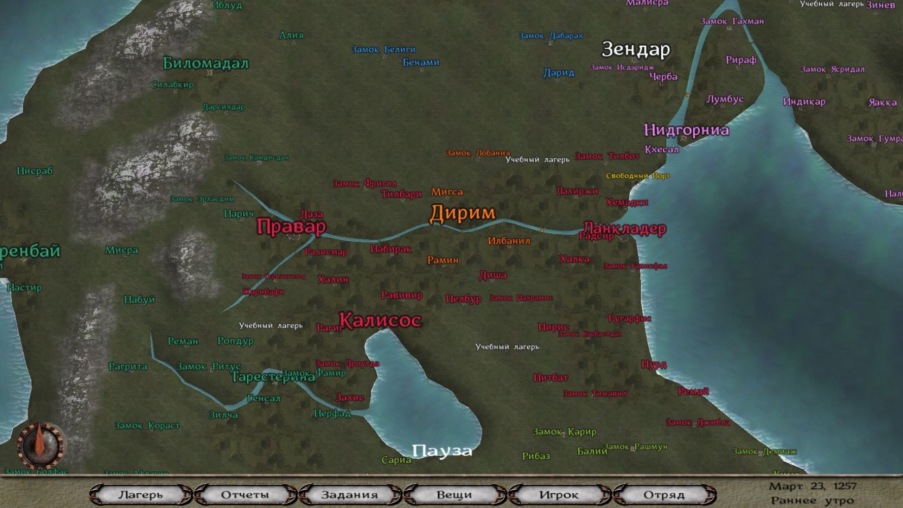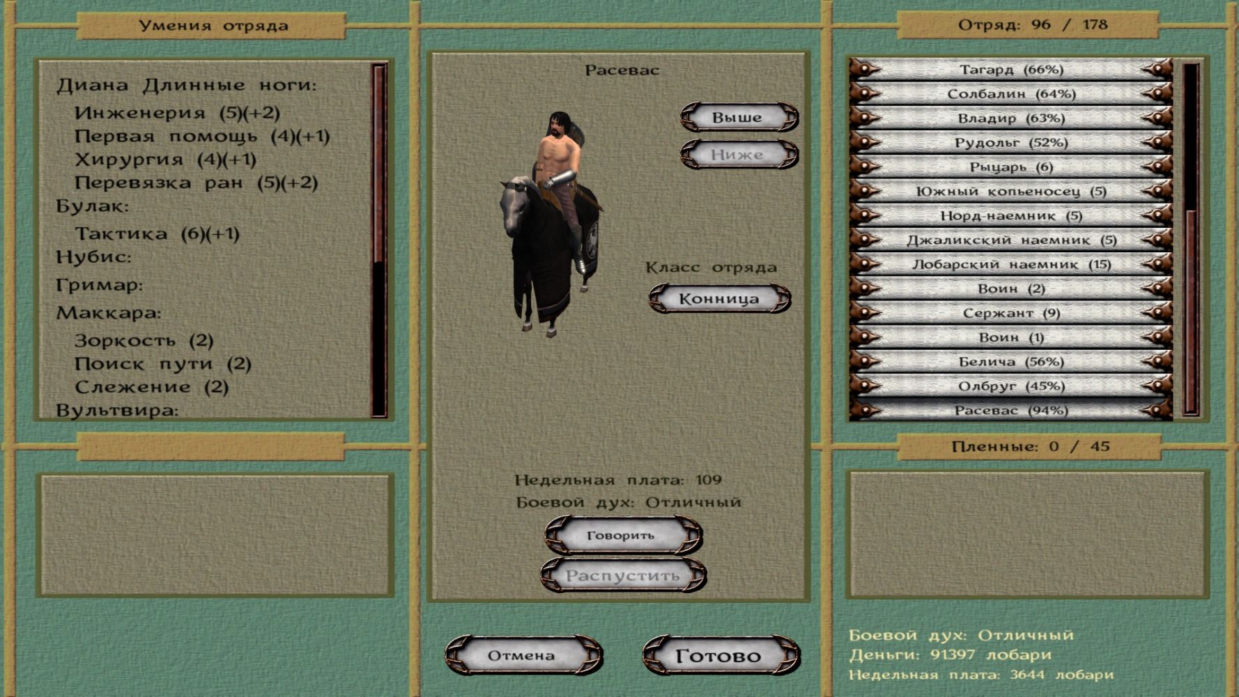 Так на рынке в городе из первого моего знаменосца я получил полноценного спутника. Владир - очень сильный конный воин с навыком тактика +5. Дальше захватив несколько замков, я прокачал еще несколько рыцарей до спутников. Ко мне присоединились Солбалин, Тагард и Гримар. Все парни с очень большими значениями навыка лидерство. Будет из кого в дальнейшем при объявлении суверенитета делать своих лордов.