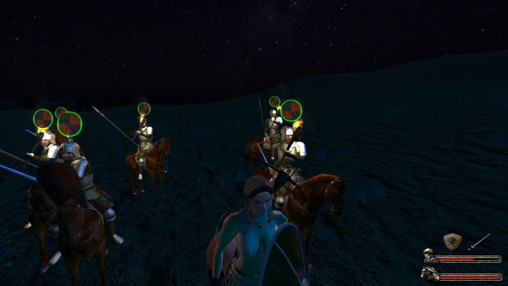 Ночная конная атака с факелами. Чем то напомнила мне кадры из фильма ''Собака Баскервиллей'', когда доктор Мортимер рассказывает легенду. Пятна света и жуть в ночи. Факелы, как и хардкордную муку, можно отключить через меню Лагерь.