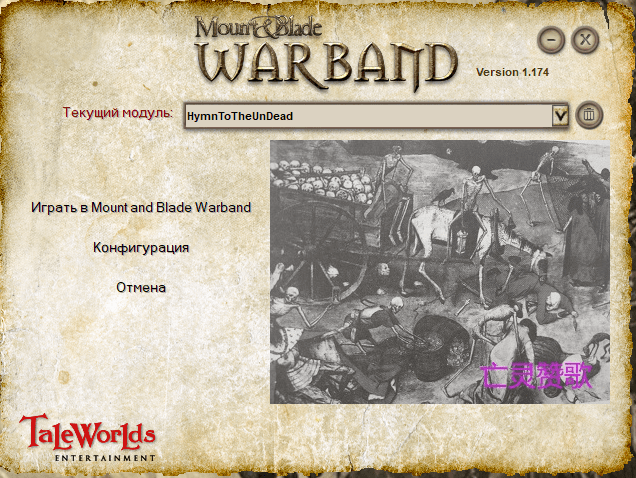 Это очень уникальная крупная модификация, недавно созданная авторами с китайского форума к празднику Лунного Нового года. Число тварей на метр квадратный больше разве что в Эре драконов. Здесь будет выбор, играть за человека или тёмное существо. В обоих случаях есть новая мрачная музыка, мини-карта в сражении, новые флаги, кони, оружие и меню (одна только заставка с соображающей на троих нежитью возле костра уже поднимает настроение). Стреляющий черепами посох и книгу некромантии, которой можно воспользоваться из меню, дадут в обоих случаях. Найти супругу также можно в обоих вариантах. Могут встречаться огромные отряды на карте. Посреднику можно продать всех пленных сразу. Имеется меню, позволяющее производить различные манипуляции с оружием, бронёй и ездовыми существами. Есть несколько новых фраз, но в целом вполне годится загружающийся перевод от warband, если у вас он установлен на основной игре. В целом эта вещь очень атмосферная и затянет любого любителя фэнтэзи.