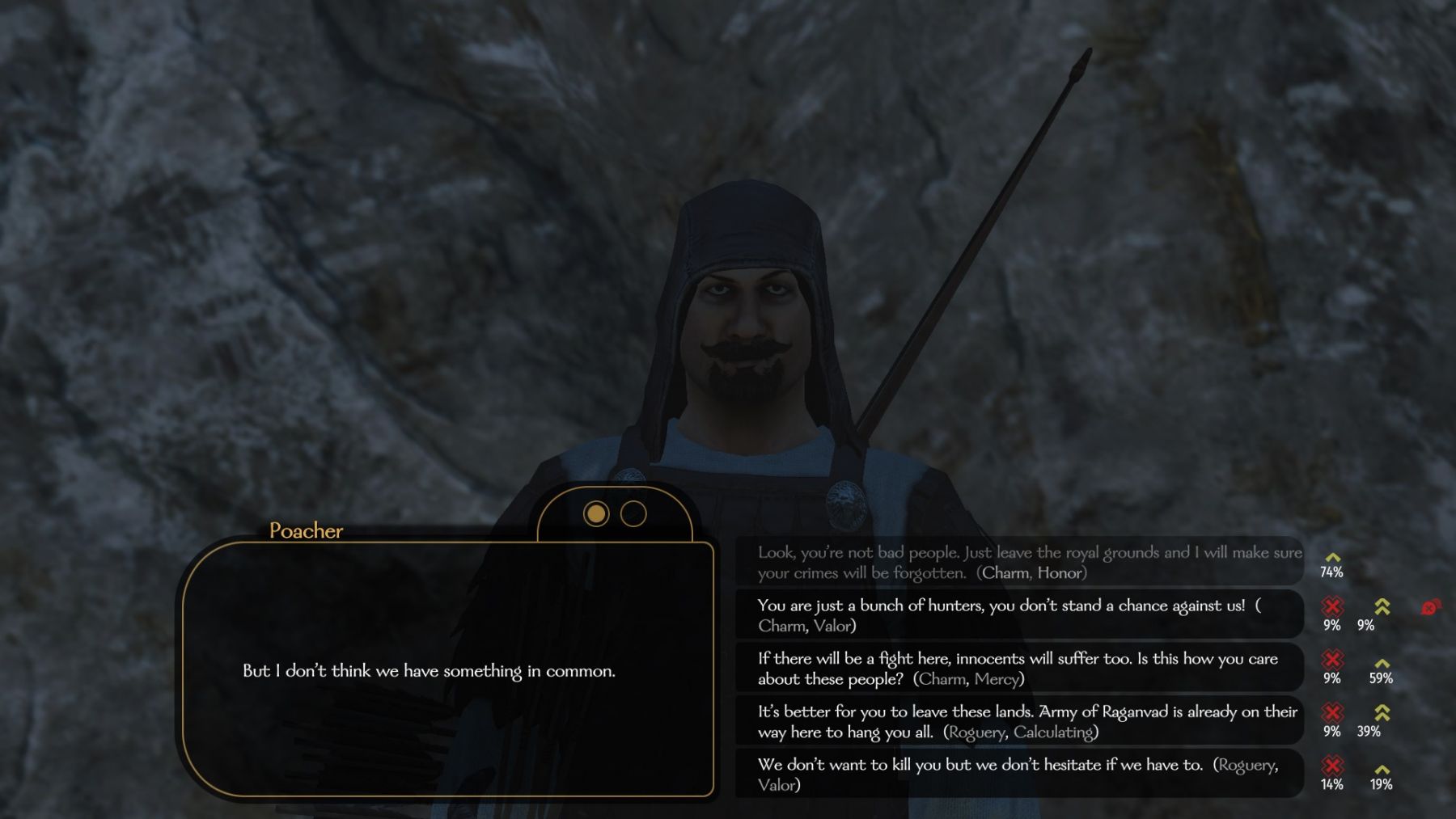 В игре существенно изменилась система прокачки главного героя. Разделение на три группы атрибутов исчезло и вместо них появились 18 прокачиваемых умений, каждое из которых отвечает за свое отдельное направление - одноручное, двуручное и древковое оружие соответственно, луки, арбалеты, метательное оружие, верховая езда, атлетика, отслеживание, тактика, создание, жульничество, обаяние, управление, торговля, стратегия, хирургия и инженерия. Большинство из них уже знакомы игрокам, другие используют новые механики или доработанные старые, например, обаяние влияет на общение с другими персонажами, а жульничество позволяет подкупать стражников и проворачивать различные темные делишки. Прокачка навыков уже сама по себе дает определенные бонусы, указанные в его описании, но это не единственная польза от них: с ростом уровня нам будут открываться и специальные перки, вложенные в соответствующий навык. По своей сути они будут аналогичным перкам из первой части Mount & Blade - какие-то будут улучшать здоровье персонажа или урон, какие-то давать более специфичные бонусы, вроде дополнительных стрел при выходе в бой на коне, но все они станут доступными только в случае должного развития соответствующего навыка. В ряде случаев открываются сразу по два перка, между которыми необходимо делать выбор - оба выбрать не получится. Прокачку последних в свою очередь можно будет ускорить специальными очками фокуса, получаемыми при повышении уровня. Сами по себе очки не дают повышения, по они ускоряют рост того навыка, в который они были вложены. Кроме того, указанные очки нужны для первичного разблокирования прокачки навыка - без вложения хотя бы одного очка навык попросту не будет прокачиваться. Данная система будет актуальной как для главного героя, так и для других игровых персонажей.