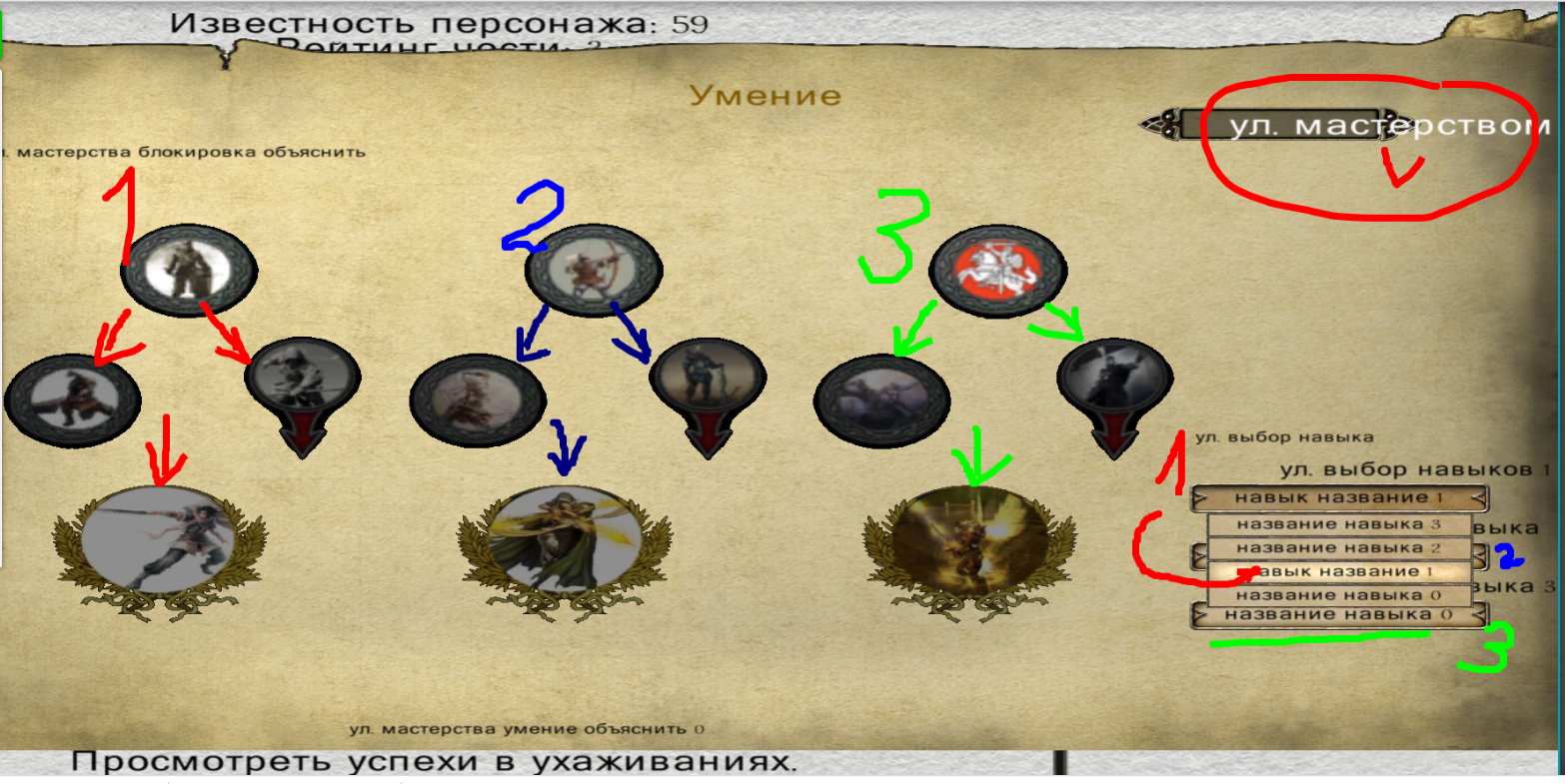 Получив задание Харека использовать навык на бандитах, сразу открываем "Отчёты", и там смотрим "Смотреть Навыки". Внимательно рассмотрите скриншот ниже, разные ветви умений я раскрасил в соответствующие цвета (да, не Шишкин, намалевал как сумел)), первое красная цифра  один возле кружочка воина со щитом. Нажимаем. Дальше в правом нижнем углу смотрим на верхнюю из полосок (всего их три, и каждая полоска соответствует всем верхним кружочкам, они как бы начальная стадия обучения. Все раскрасил соответственно. Нажимаем на полоску, там появляются цифры, 1 - самый верхний кружок, цифры дальше соответствуют кружкам, расположенным ниже, это ответвления основного умения. Выбираем там цифру один "навык название 1". Всё, закрываем таблицу умений в правом верхнем углу, где помечено красной галкой, просто хлопните на надпись "Ул мастерством".