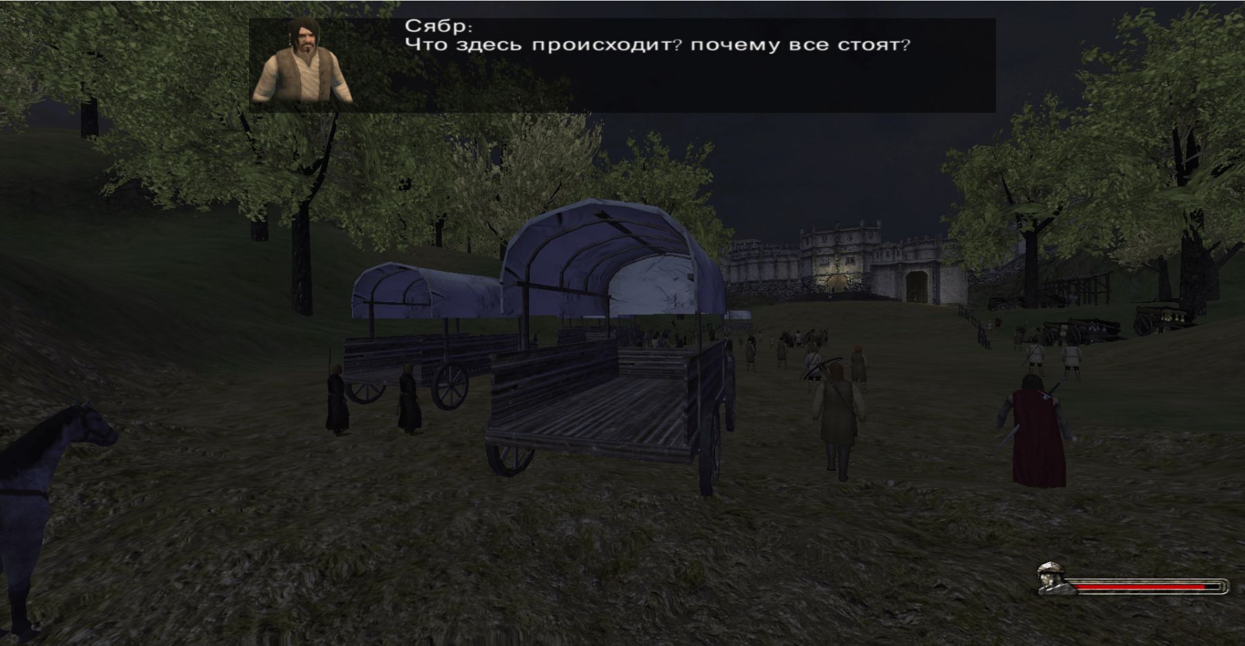 Эта крупная модификация - очень интересная разработка китайского автора, которую он поддерживает уже несколько лет. Имеется много уникальных особенностей, вы можете играть в неё как в обычный мод в режиме песочницы, а можете запустить сюжет, выбор предоставляется в самом начале. Если с первым всё понятно, то со вторым потребуется немного поломать голову. Сюжет вы начинаете с квеста отдохнуть (подходите к кровати и держите клавишу взаимодействия до конца полоски) и поручения капитана выследить и убить в лесу бандитов, для этого необходимо подкрадываться, это Ctrl, а не Shift, как там написано (существующий перевод - от старых версий). Подкрадывайтесь и бейте их из положения "присев" кулаком. Когда доходите до ворот с несговорчивым стражником - сначала поговорите со своим капитаном, потом сбегайте до этого самого стражника, потом вернитесь к капитану и доложите. Во время привала можете взять лошадь и объехать окрестности, за отведённое время познакомьтесь с кем-нибудь, в моём случае другом стал монах, после чего привал закончился и больше такой возможности не будет.