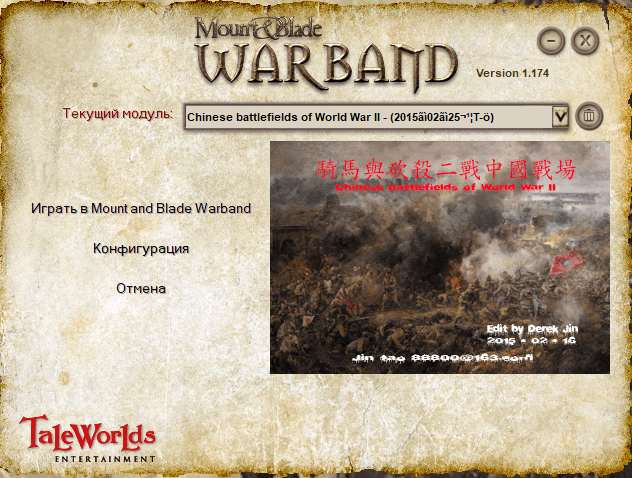 Эта модификация от разработчиков из Китая изображает период середины 20 века, а именно II Мировую войну. Оригинальное название автора читается как "二战中国战场". Есть новые флаги и меню, карта старая, но наименования поселений другие. Из оружия замечены пулемёты и винтовки, большинство из них можно купить. Есть самодельные гранаты у бандитов, которых не найти в продаже. Заменены звуки и музыка. Переодеты все кто только можно, включая крестьян, стражников, наёмников, путников, поэтов, посредников, правителей и претендентов. У последних - стильные костюмы с галстуками. Фракции часто заключают союзы, назначенный лордом спутник получает геральдическую броню. Изменены все ветви развития войск, а сами они одеты в форму. Управление своим королевством осуществляется через одного министра.