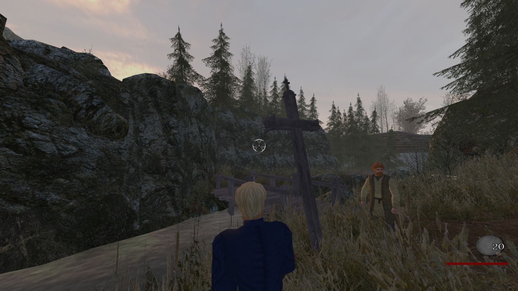 После создания главного героя (не героини) вы возникаете в стартовой локации рядом с корчмой. Встреченный вами крестьянин просит разобраться с бандитами и освободить пленных.