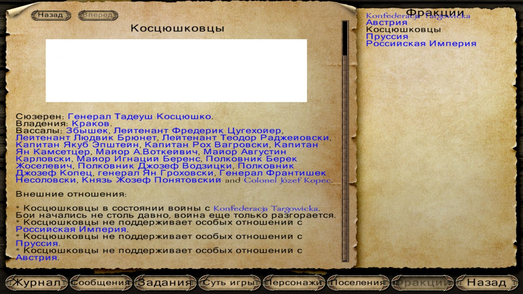 На глобальной карте тоже произошли интересные изменения - появилась новая фракция Косцюшковцы (зачет переводчику) и изменились отношения других фракций к ГГ (с Австрией стало +10, с Тарговицкой конфедерацией -100). А сам ггешка становится вассалом этой новой фракции.