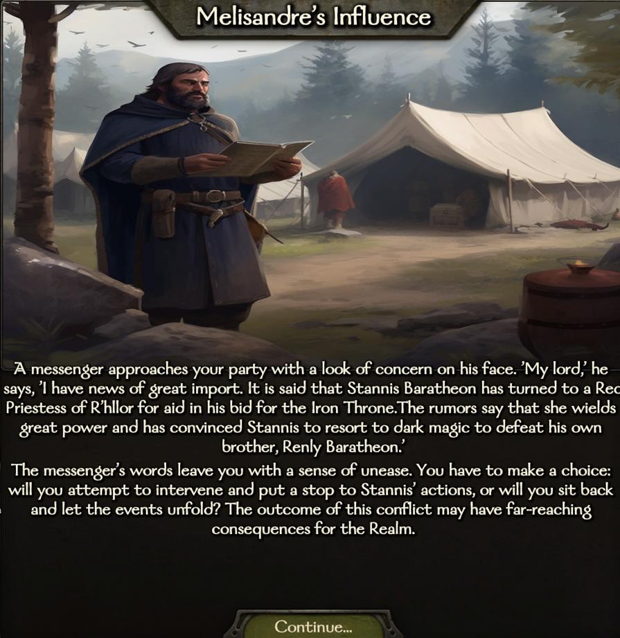 • Смерть Ренли (Renly Death Event). Это событие происходит на 134-й день и может быть изменено. Оно состоит из 2 всплывающих окон. Если вы сможете ** УБИТЬ СТАННИСА** (**KILL STANNIS**) после первого, то Ренли выживет и объединит Штормовые земли!