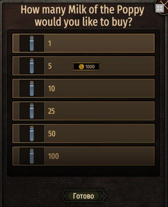 В последних версиях мода было добавлено Milk of the poppy (маковое молоко) с помощью которого можно хилить себя в бою при нажатии клавиши Q. Маковое молоко продается в Королевской Гавани у Мейстера Пицеля 1000 золота за шт. С ним достаточно один раз поговорить в чертогах властителя и будет доступна быстрая покупка через диалог из меню города. Также есть возможность получить его в трофеях.